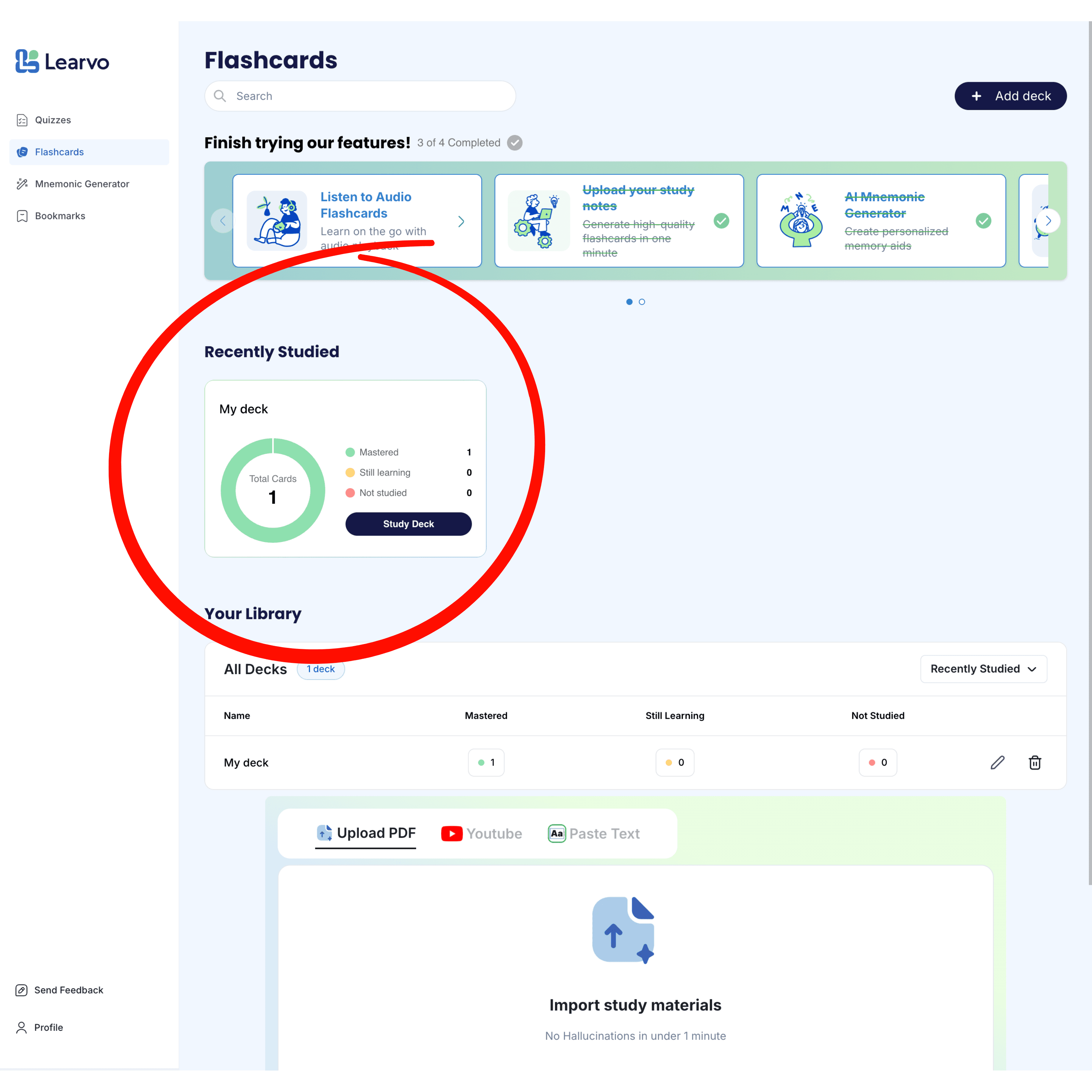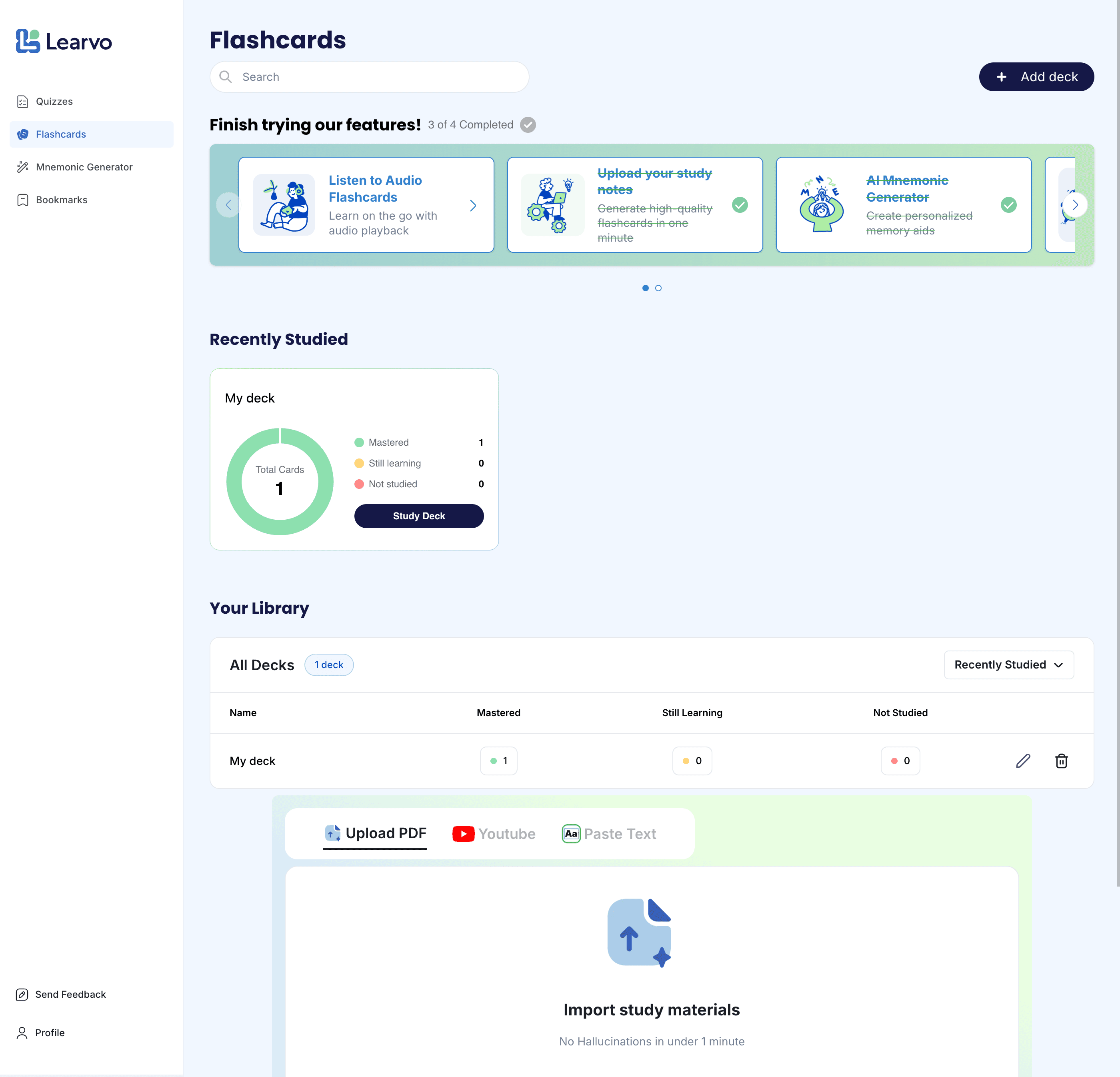 Flashcards: upload notes → generate a deck → start Spaced Repetition or Audio Flashcards