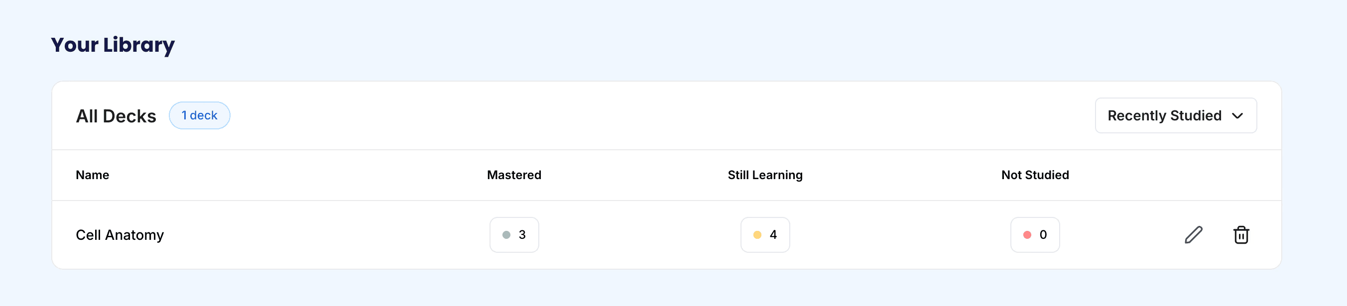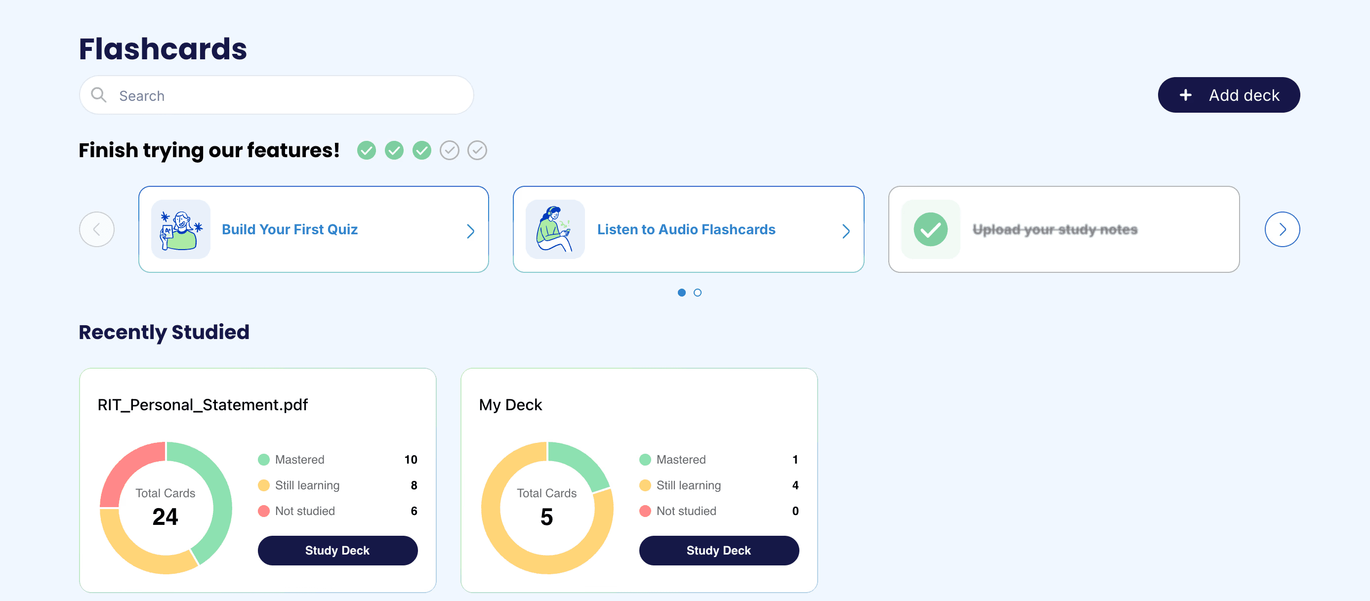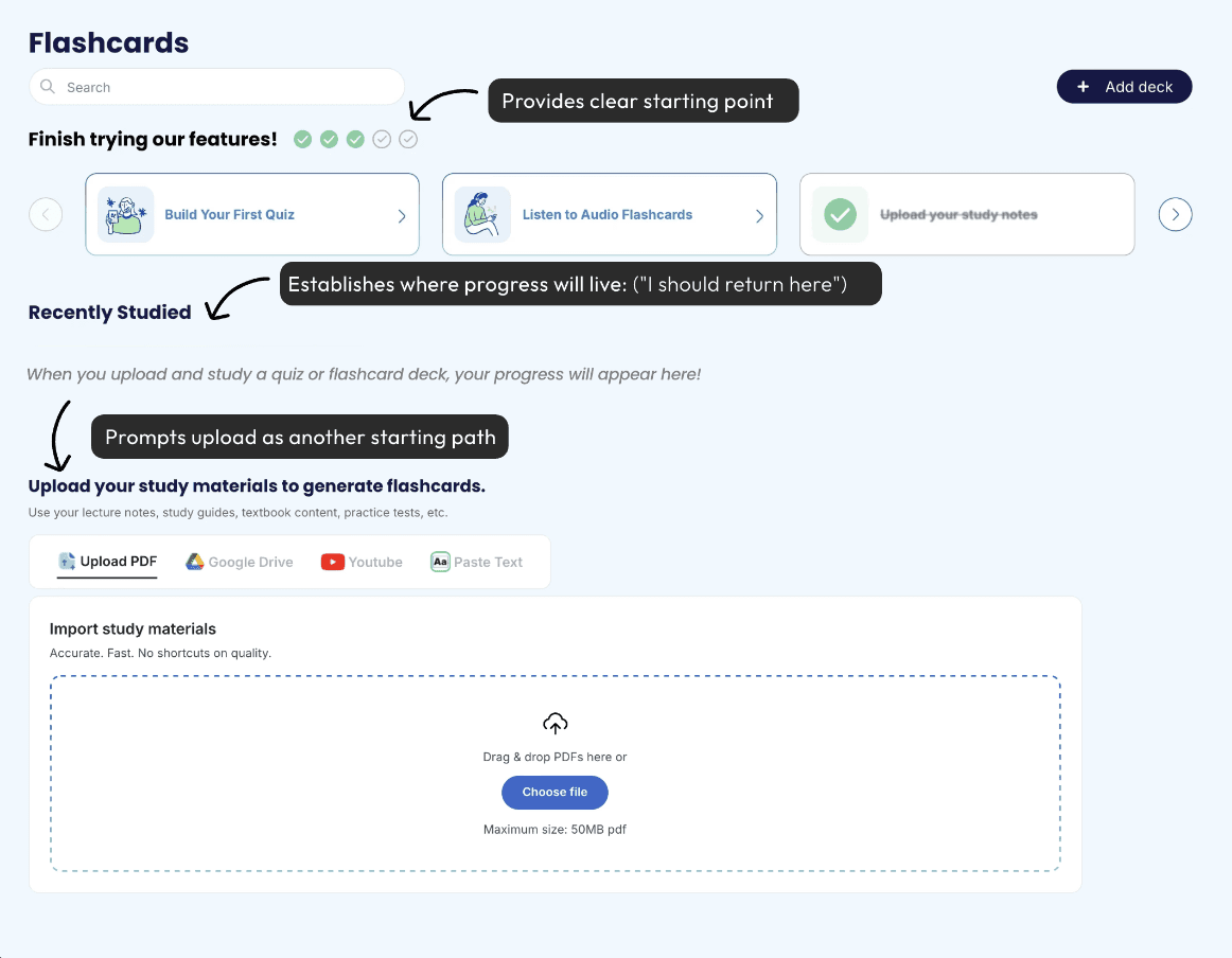 Decision: I repurposed the Flashcards page into an interim home state by combining first-time guidance with return-and-resume signals: the activation banner, Recently Studied, progress cues, and reliable logo-to-home behavior.