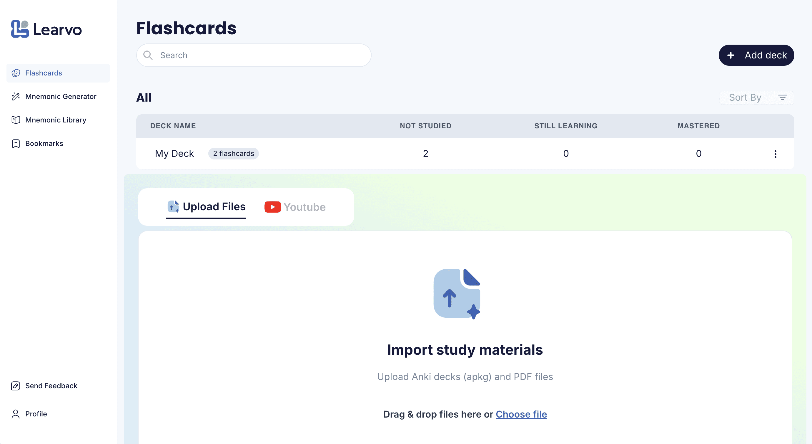 Learvo is an AI-powered flashcard platform built around spaced repetition, with tools to generate flashcards from notes or videos and support learning through mnemonics and audio.