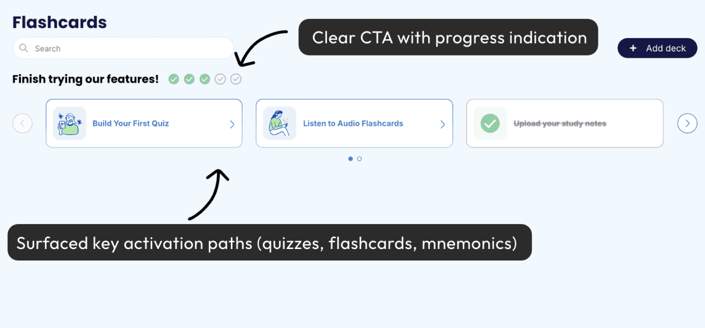 For this project, first-session activation meant helping a new user successfully complete at least one core study workflow: Flashcards, Mnemonics, or Quizzes.