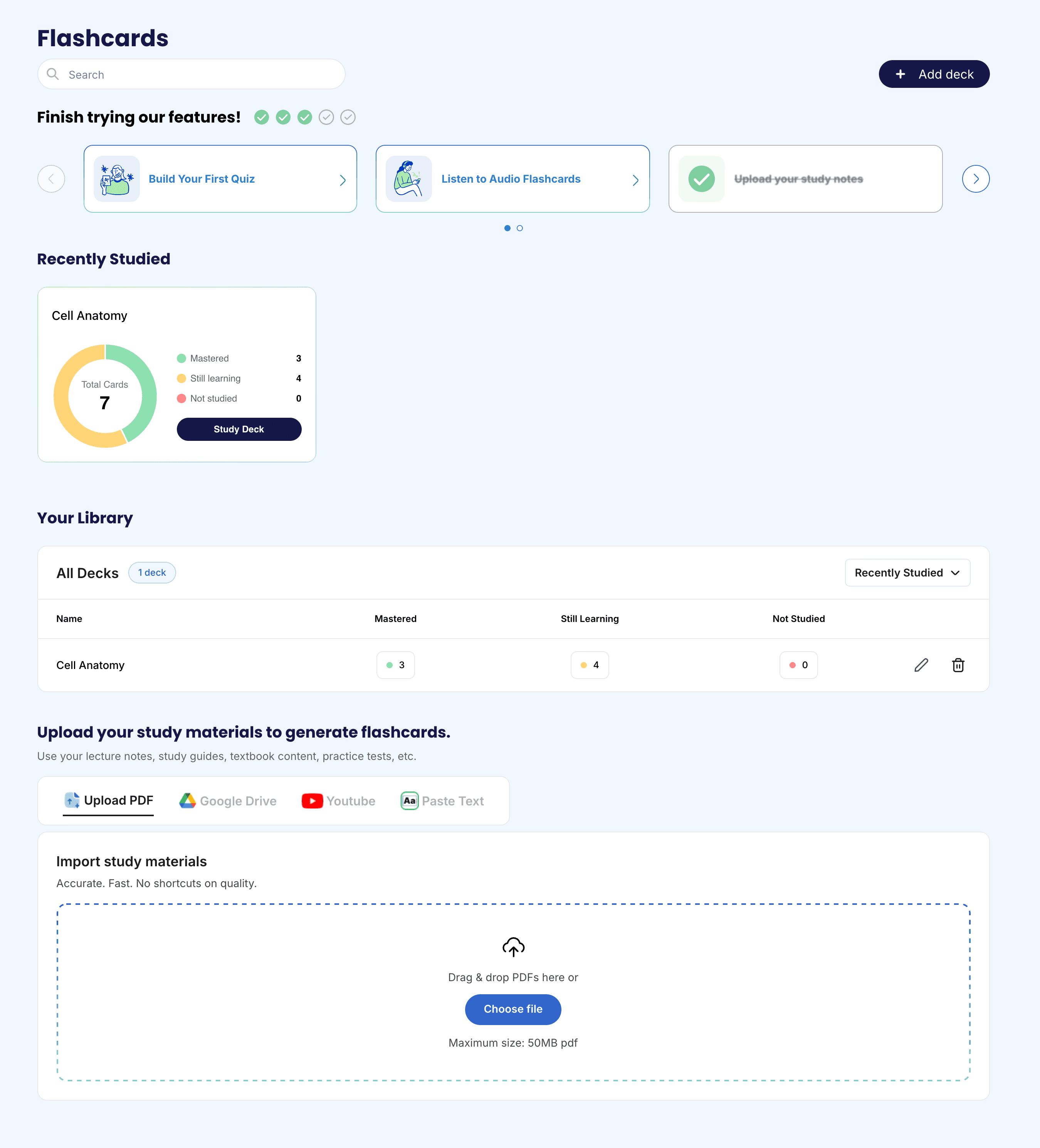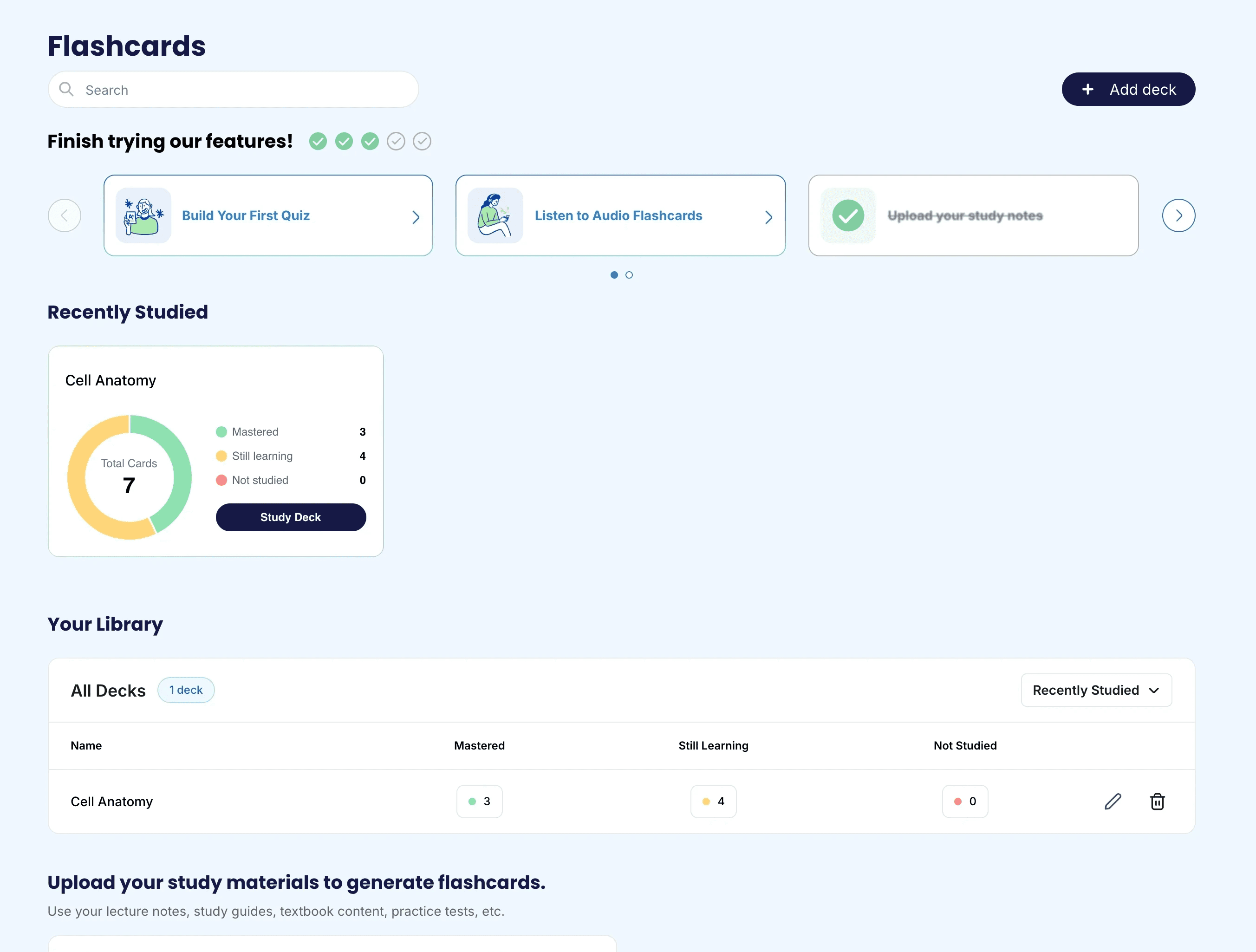 Learvo is an AI-powered learning platform, offering tools like flashcards, mnemonics, and quizzes. I redesigned the first-time user experience to help new users find a clear starting point, try a core study workflow, and experience value in their first session.