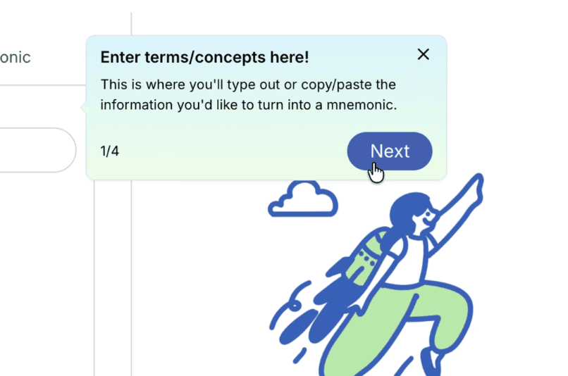 Added in-feature coach marks that guide the first critical interaction (e.g., Mnemonics: “Enter terms/concepts here” → step 1/4 → Next) so users can complete a first success moment confidently.