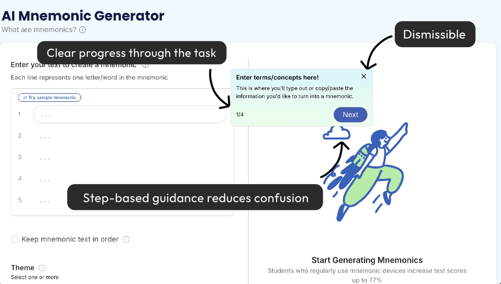 Learvo is an AI-powered learning platform, offering tools like flashcards, mnemonics, and quizzes. I redesigned the first-time user experience to help new users find a clear starting point, try a core study workflow, and experience value in their first session. Because engineering capacity was limited, I focused on strategic, lightweight improvements that could ship quickly.