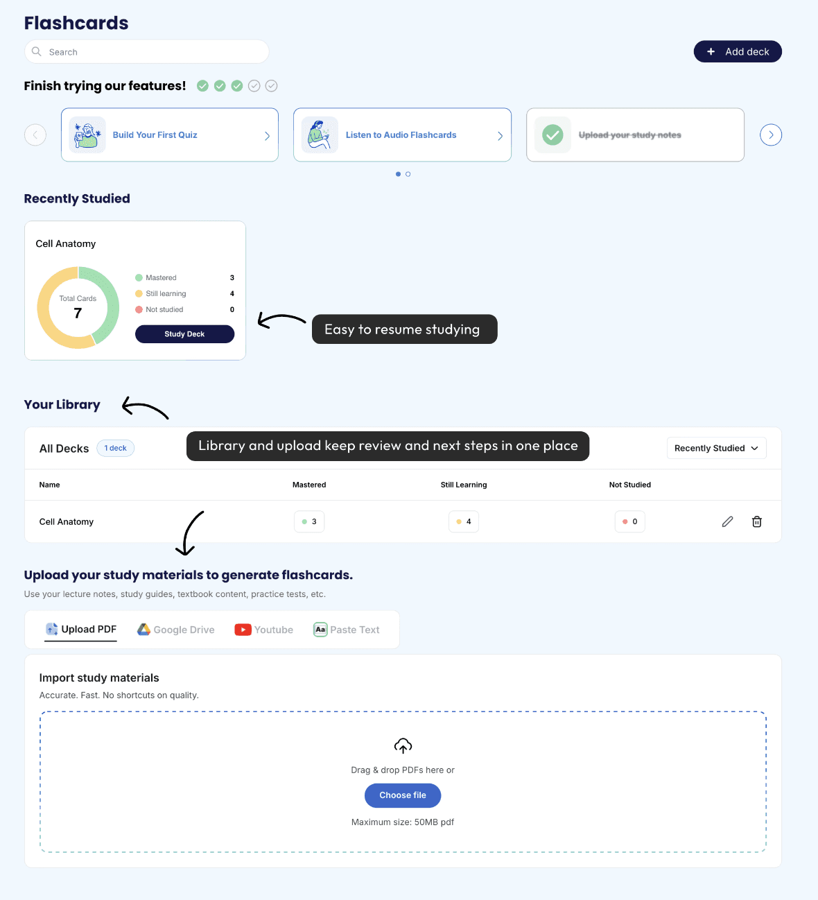 Surfaced key activation paths (quizzes, flashcards, mnemonics)
